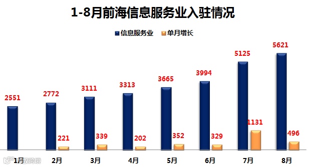 8月,前海信息服务业企业总数达到5621家,8月增长496家,增速回归常态。