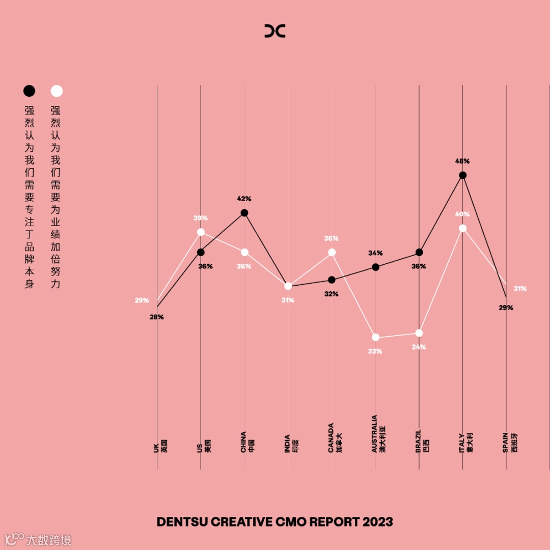 75%认同我们需要为业绩而加倍努力,33%表示“强烈”同意。当然,也存在明显的地方差异——中国、巴西和意大利的营销从业者更倾向于认为,是时候更多地关注品牌本身了。