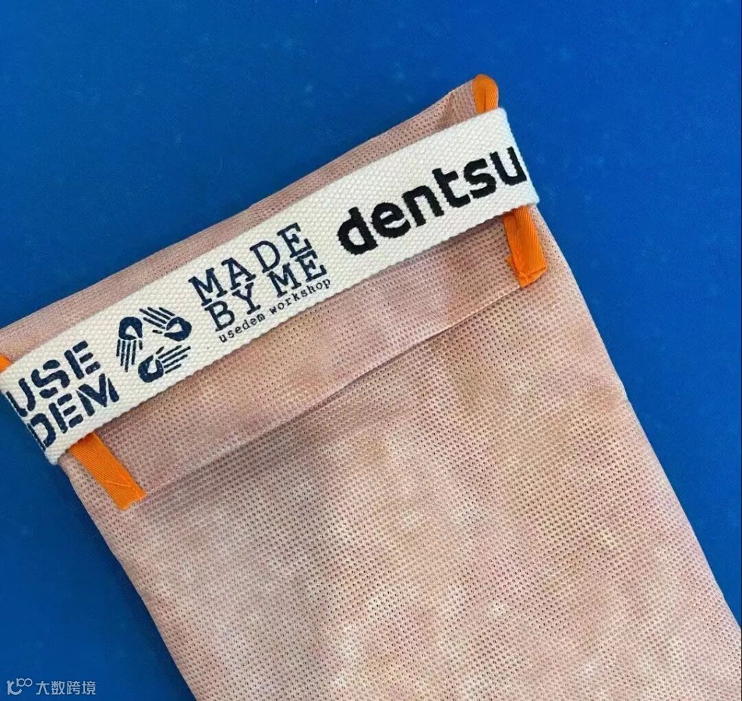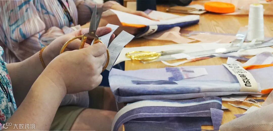 裁剪完成后,将带有电通logo的定制织带,与裁好的面料缝合起来。