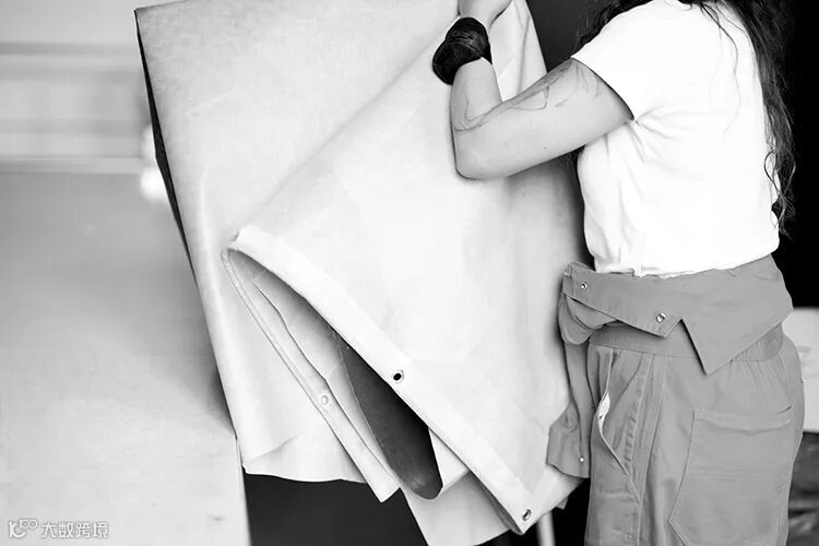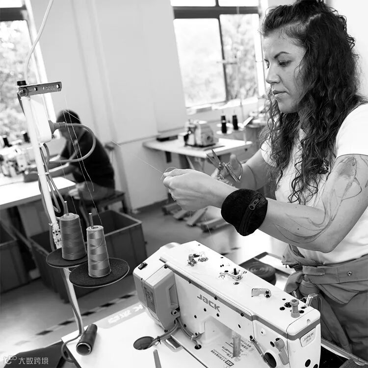 Ready, steady, sew! Revving up the sewing machines to stitch the PVC vinyl and denim materials together.