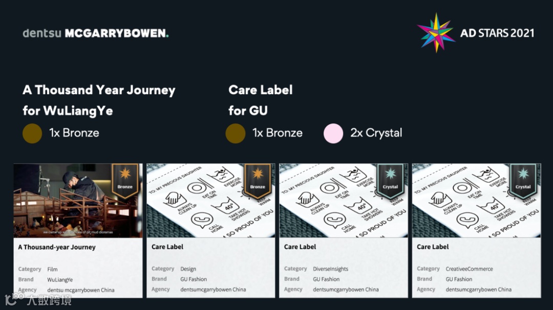 电通创意中国区CEO、dentsu mcgarrybowen中国CEO石川惠太表示:“恭喜获奖的团队,我们的创意实力也为dentsu集团获得Network of the Year作出了贡献,期待未来我们能有更多的优秀作品在国际舞台上绽放光彩。” dentsu mcgarrybowen中国首席创意官Kaz表示:“很高兴看到我们的作品能够获得等级奖项。GU的节日营销在取得良好效果的同时也为消费者带去了更多温暖,相信这个作品能够在临近中秋的这个时节,引起更多人的共鸣。” * 关于 AD STARS 创办于2008年的AD STARS釜山国际广告节,是亚洲最大的广告节之一。以“共享创意解决方案,改变世界”为宗旨,致力于通过广告和交流平台,促进全球广告产业发展。