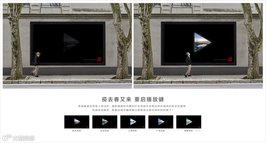 每当传感器感应到有行人经过,播放键图形内置的灯就会亮起并呈现出所在城市的标志性景观,意寓着重启城市播放键,让城市换发往日风采。