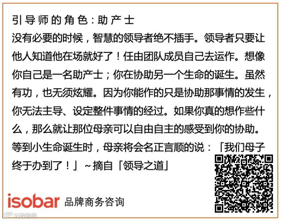 黄郁娟(Cecilia Huang),安索帕中国品牌商务咨询群资深副总裁,从2004年接触引导技术到现在,已经有超过15年的引导经验。融合了包括ICA(国际文化学会)一系列引导技术、NLP(神经语言程式学)教练技术、Design Thinking(设计思维)、以及未来思考 (Futures Studies)等。利用这个技术协助许多安索帕的客户用敏捷的方式有效的形成策略共识。欢迎各界交流,邮箱地址: