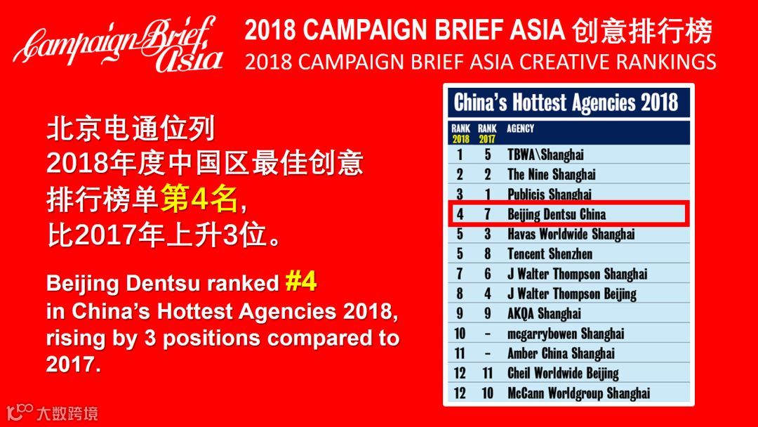 近一年,在各类全球、区域和国内创意奖项中,北京电通佳绩不断。在最新颁布的Campaign Brief Asia 2018亚洲创意排行榜中,北京电通位列China's Hottest Agencies (2018年度中国区最佳创意排行榜单) 第4名,比2017年上升3位。相较于2016年的第21名,北京电通连续两年排名大幅提升,充分说明了创意水平在明显进步。今后北京电通将继续强化创意能力,加强创意与数字、移动、科技、以及内容营销等领域的结合,不断尝试创新,为客户打造可持续的强劲品牌做出贡献。