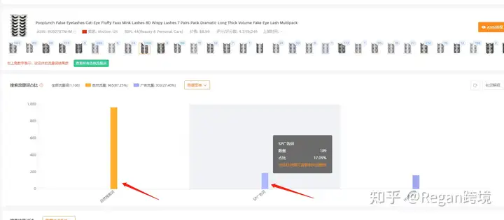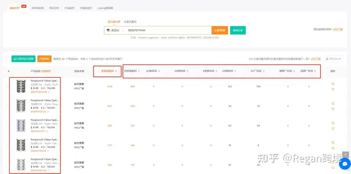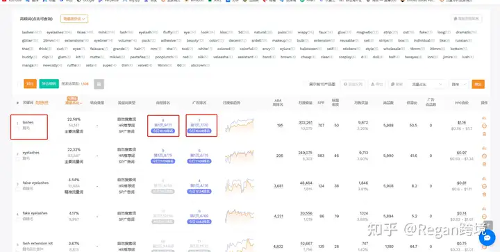 以这个竞品为例,lashes关键词为竞品带来了总计22.58%的流量,是竞品的主流量词。并且竞品针对这个关键词有三个排名位置,也就是三个流量来源: