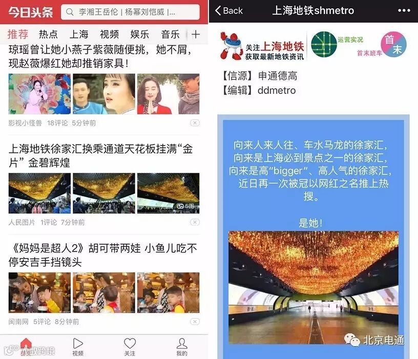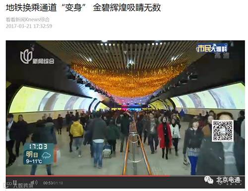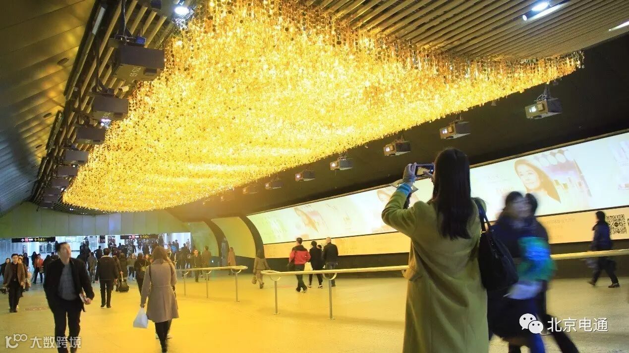 3月19日,上海徐家汇1/9/11号线换乘通道天花板上挂满了金光灿灿的亮片,在灯效的映衬下金碧辉煌、流光溢彩,让人流连忘返,路过乘客纷纷掏出手机拍照留念。