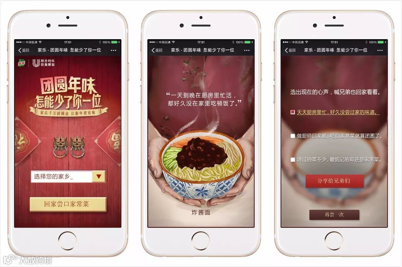 通过微信,一部向厨师致敬的微电影在他们的手机屏幕上以原生广告的形式出现。用户可以进而体验涵盖了全国34个省级行政区,汇集34道特色家乡菜和方言的H5互动页面。
