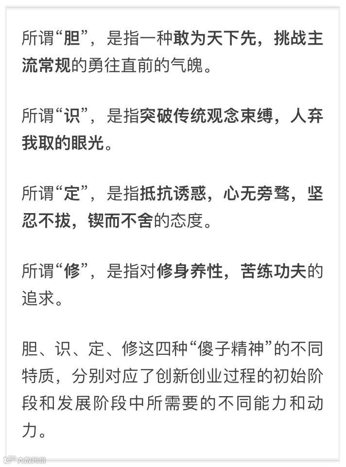 对于两创而言,超人的信心和勇气比一流的智商更为重要,而“傻子精神”中的“胆”,恰恰能提供可贵的信心和一往无前的勇气。