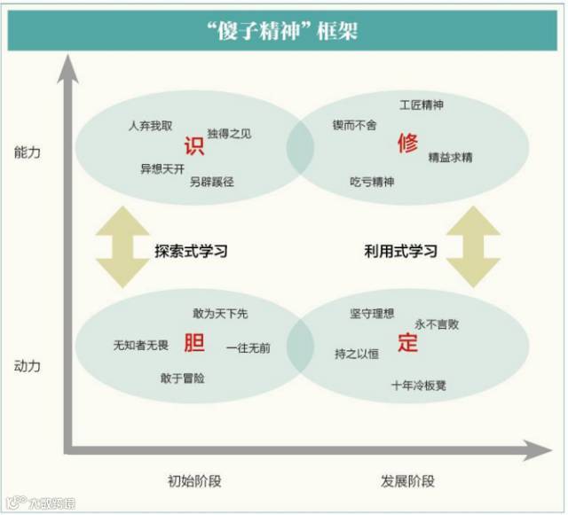 我们发现,“傻子精神”四个特质形成的两组不同的能力/动力组合,“胆”+“识”与“定”+“修”,分别对应了不同阶段的不同学习需求。