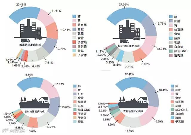 (我国城市(上图)和农村(下图)前十位恶性肿瘤的发病和死亡构成)