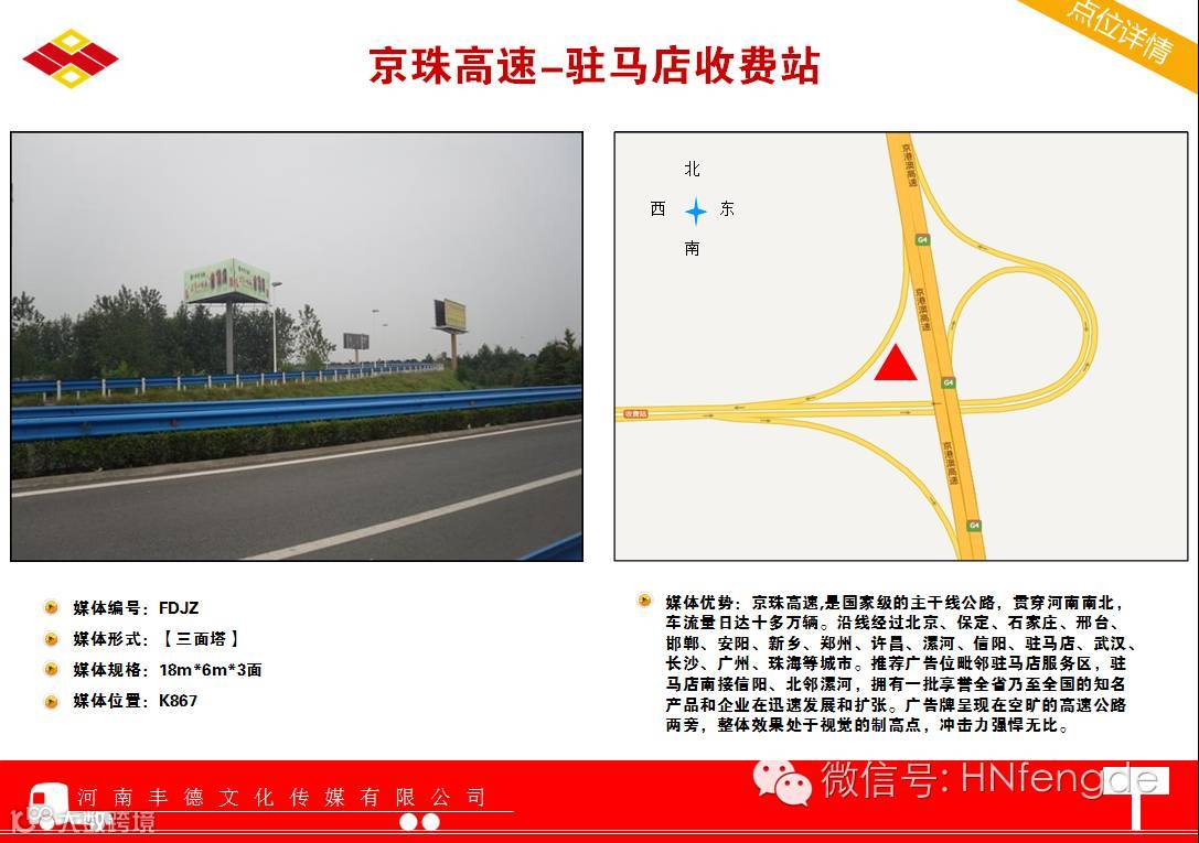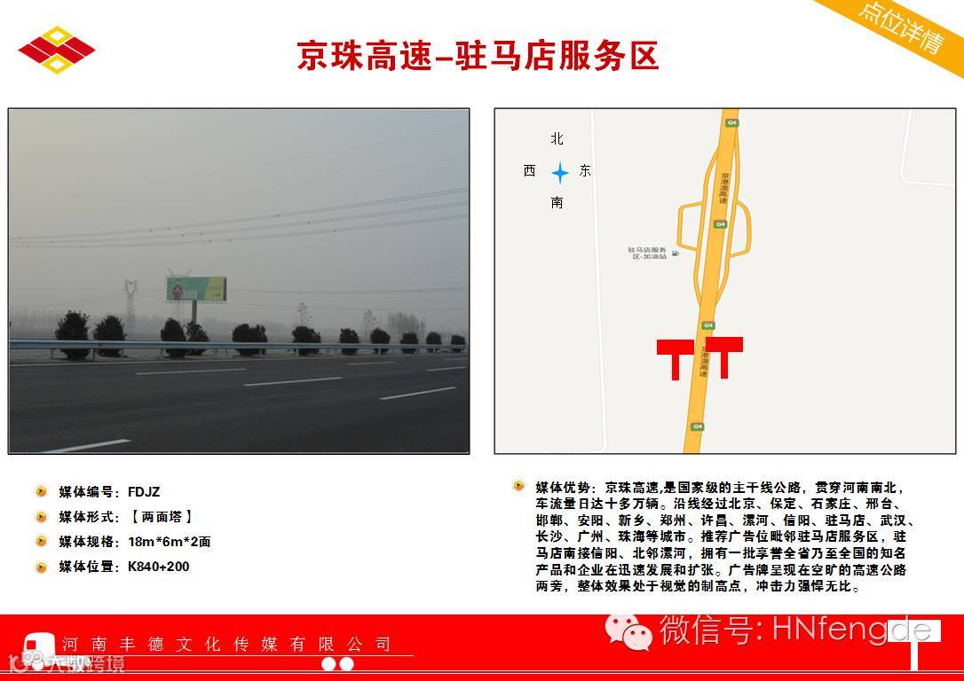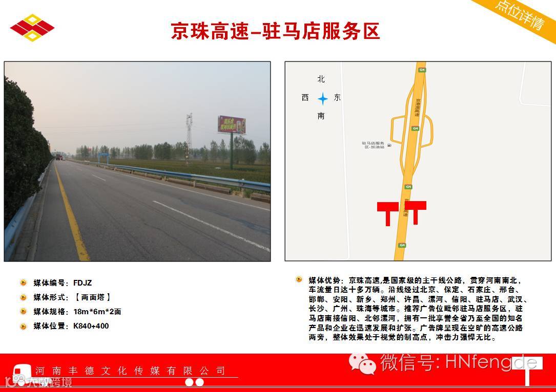 媒体优势:京港澳高速,是国家级的主干线公路,贯穿河南南北,车流量日达十多万辆。沿线经过北京、保定、石家庄、邢台、邯郸、安阳、新乡、郑州、许昌、漯河、信阳、驻马店、武汉、长沙、广州、珠海等城市。推荐广告位毗邻驻马店服务区,驻马店南接信阳、北邻漯河,拥有一批享誉全省乃至全国的知名产品和企业在迅速发展和扩张。广告牌呈现在空旷的高速公路两旁,整体效果处于视觉的制高点,冲击力强悍无比。