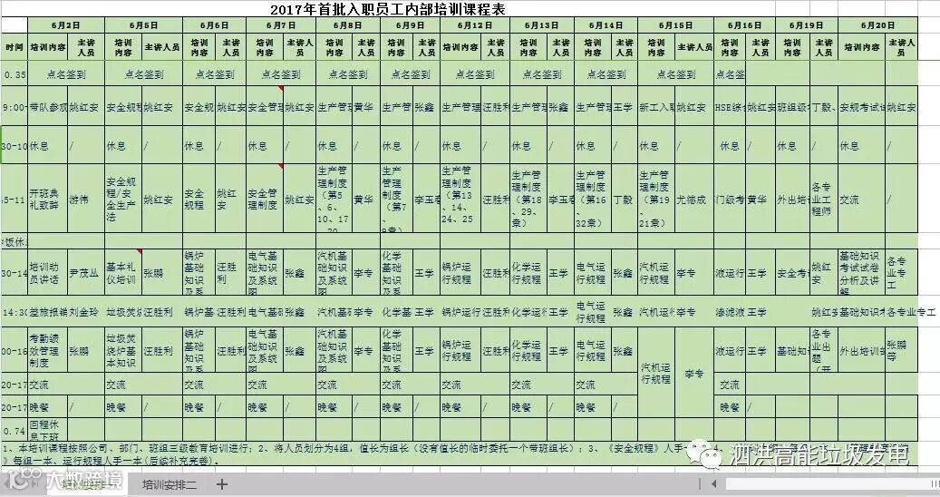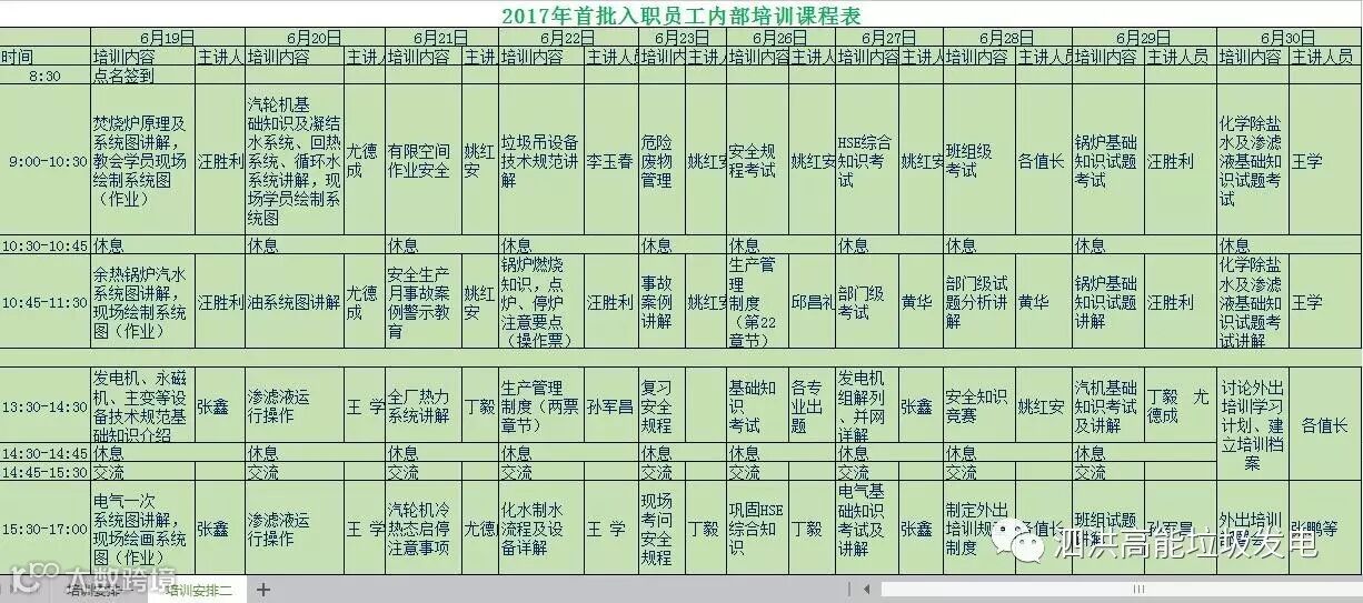 对照课程表,各专工及部门负责人认真做好了课件,广泛搜集了设备资料,依据培训大纲,全面系统地对垃圾焚烧发电进行讲解,侧重了设备构造性能原理,运行操作及故障排除等方面培训。安全专工先后组织十余次安全教育,就《安全规程》及事故预案等进行了讲解;机务专工就几种工作票的签发人、负责人、许可人、监督人等职责详细进行了分析,尤其在安全技术保障和组织措施保障方面给出了独到见解。
