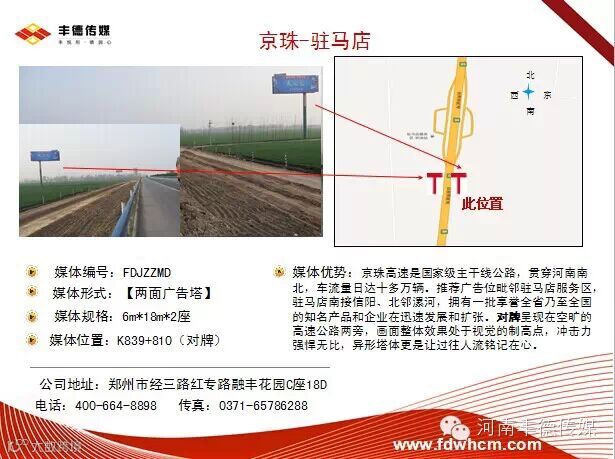 导读: 媒体编号:FDJZZMD媒体形式:【两面广告塔】媒体规格:6m*18m*2面媒体位置:K839+810
