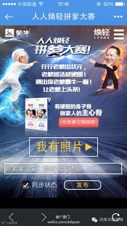 ,蒙牛焕轻联手人人网发起“人人焕轻拼爹大赛”,鼓励用户晒出老爸尊容、大胆“拼爹”,帮助年轻人表达对父亲的爱。不过,这次“拼爹”拼的并不是老爸的富有和财富,而是他们的健康与活力。