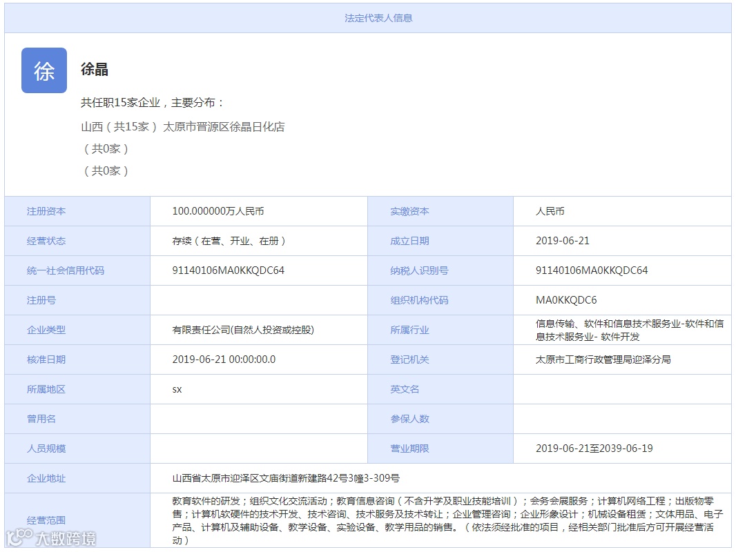 据企盾宝资料显示,山西龙之门教育科技有限公司成立于2019年6月21日,注册资本100万元人民币,法定代表人为徐晶,经营范围包括教育软件研发、教学用模型及教具销售、软件销售、中小学生校外托管服务、软件外包服务等。