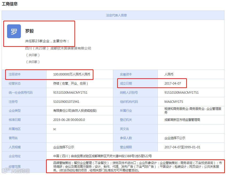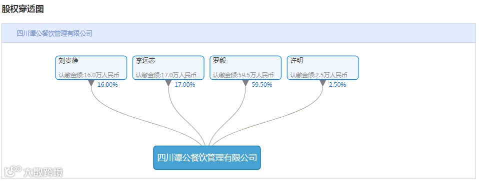 而通过企盾宝关系探寻功能,可以发现四川谭公餐饮管理有限公司的大股东是成立于2017年4月的四川至膳品牌管理有限公司。而四川至膳品牌管理有限公司的法定代表人同样也是罗毅,公司注册资本100万人民币,经营范围包括:品牌营销策划;餐饮企业管理(不含餐饮);企业营销策划等。股东信息显示,该公司由刘佳和江弋共同持股,持股比例分别为49%和51%。
