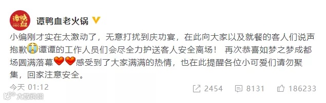 一顿火锅还没吃完,肖战不得不在工作人员的护送下离开。随后,6月21日凌晨,谭鸭血官方紧急发布致歉声明,为暴露肖战行踪导致其遭围堵而致歉,并表示是小编太过激动,无意打扰庆功宴,工作人员们会尽全力护送客人安全离场,同时也表达了对《如梦之梦》成都场圆满落幕的祝贺。