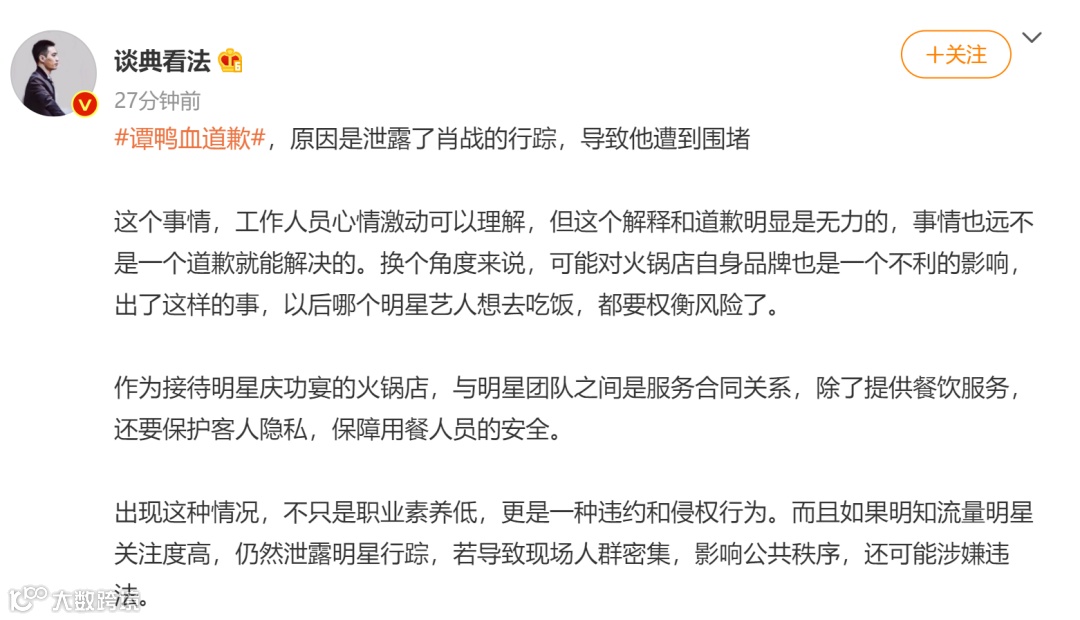 近日,谭鸭血的一篇道歉发文火了,直冲热搜第一。据悉,6月20日,艺人肖战参演的话剧《如梦之梦》成都站的最后一场演出收官。当晚,肖战与同剧组成员选择在谭鸭血老火锅店举办庆功宴,根据微博流传的截图,疑似谭鸭血店方人员提前泄露了该消息,导致路人、粉丝围堵围观。