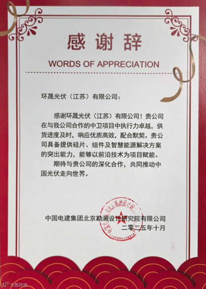 此外,中国电建北京院在感谢信中特别提到,在与TCL中环电池组件合作的“中卫项目”中,TCL中环电池组件展现出卓越的执行力、及时的供货进度、高效的响应机制与默契的协作精神。信中强调,TCL中环电池组件在硅片、组件及智慧能源解决方案方面具备突出能力,能够以前沿技术为项目赋能,助力中国电建北京院推动光伏产业高质量发展。