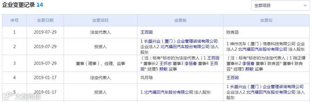 再通过企盾宝的股权穿透功能模块,可以看到,北京宝沃汽车有限公司的两大股东为神州优车(厦门)信息科技有限公司和北汽福田汽车股份有限公司分别占股75.2%和24.8%。