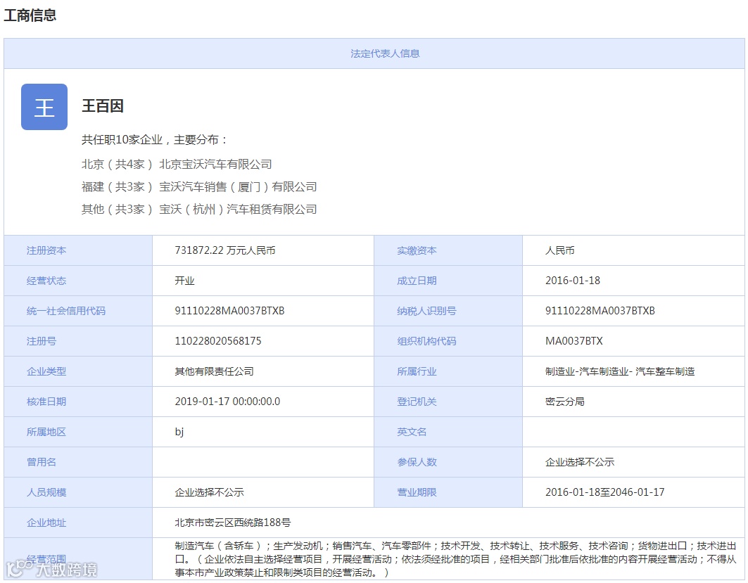 据企盾宝资料显示,北京宝沃汽车有限公司成立于2016年1月18日,公司法人代表为王百因,公司注册资金约为73.2亿元,公司主要经营范围是制造汽车(含轿车);生产发动机;销售汽车、汽车零部件;技术开发、技术转让、技术服务、技术咨询;货物进出口;技术进出口。