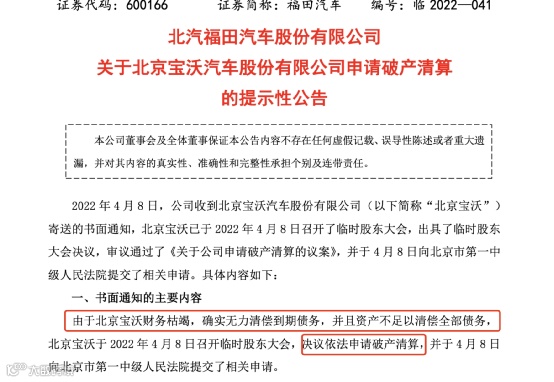 宝沃申请破产的消息来自上市公司北汽福田汽车的公告。福田汽车称,因为宝沃汽车的借款、欠款、担保及股权投资收益等,预计共影响2021年度利润总额为负53.26亿元左右。
