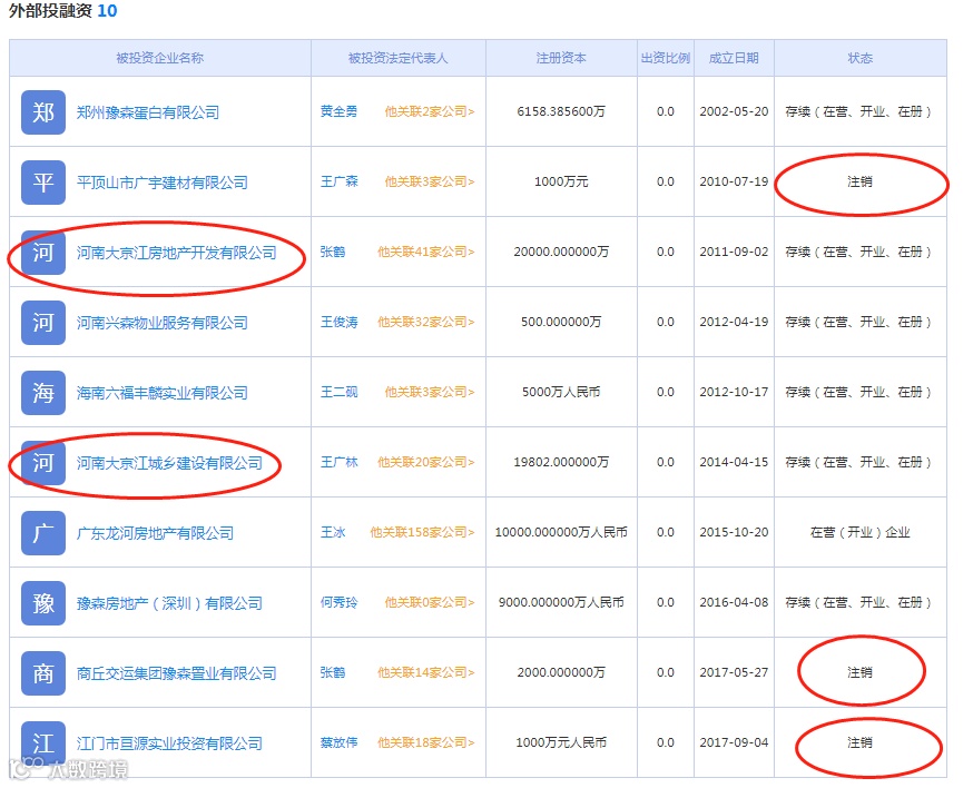 此外,豫森地产集团有限公司对外投资企业还有10家,其中包括河南大京江城乡建设有限公司和河南大京江房地产开发有限公司。其中平顶山市广宇建材有限公司、商丘交运集团豫森置业有限公司、江门市亘源实业投资有限公司均已注销状态。