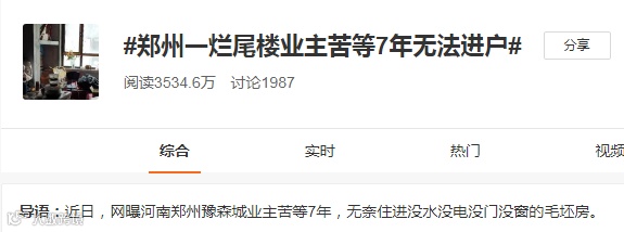而如今,又一楼盘烂尾登上微博热搜,#郑州一烂尾楼业主苦等7年无法进户#。原因仍然十分简单粗暴,开发商资金链断了。近日,网曝河南郑州豫森城业主苦等7年,仍没有等来自己所购房子的钥匙,被逼无奈住进没水没电没门没窗的毛坯房。