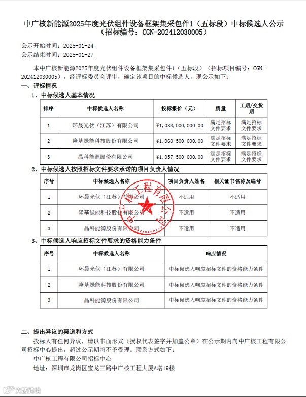 春节前夕,市场拓展再传捷报。TCL中环环晟成功入围中广核新能源2025年度光伏组件设备框架集采,一举中标五标段1.5GW大单,以奋进之姿冲刺年度销售目标。