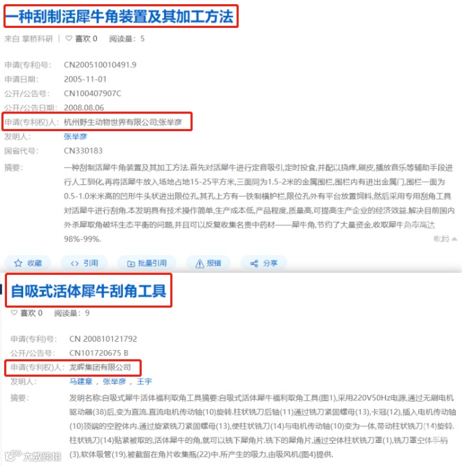 不禁引发人们的猜想,龙晖药业所称的“依托珍稀野生动物资源”,是否与龙晖集团旗下野生动物世界业务存在关联?毕竟龙晖集团法人张举彦,曾经以杭州野生动物园为名义,申请了“一种刮制活犀牛角装置及加工方法”的专利。后来他和团队又以龙晖集团的名义,申请了“自吸式活体犀牛刮角工具”的专利。