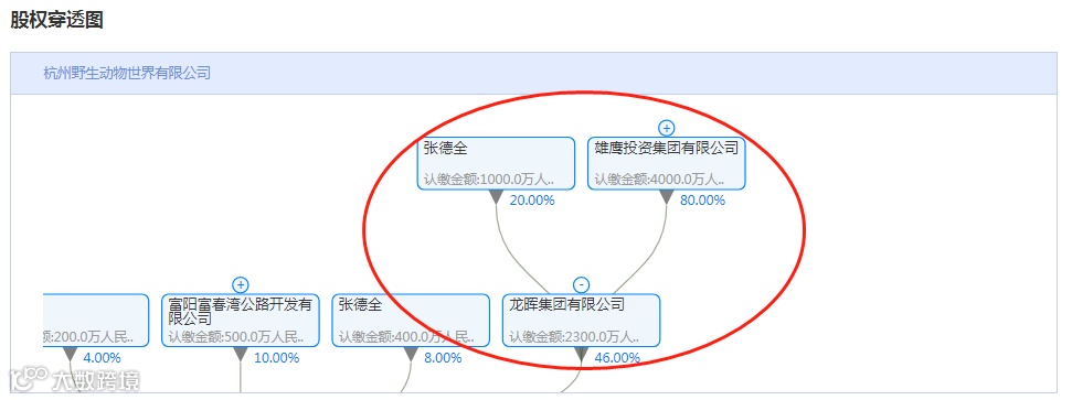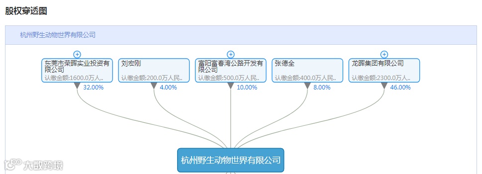 与此同时,杭州野生动物世界背后的投资股东也引发诸多关注。企盾宝发现,与大多数省级动物园为国有资本控股不同,杭州野生动物世界最大的持股股东是一家名为龙晖集团的民营企业。从企盾宝股权穿透图可以看到,龙晖集团的占股达到了46%。
