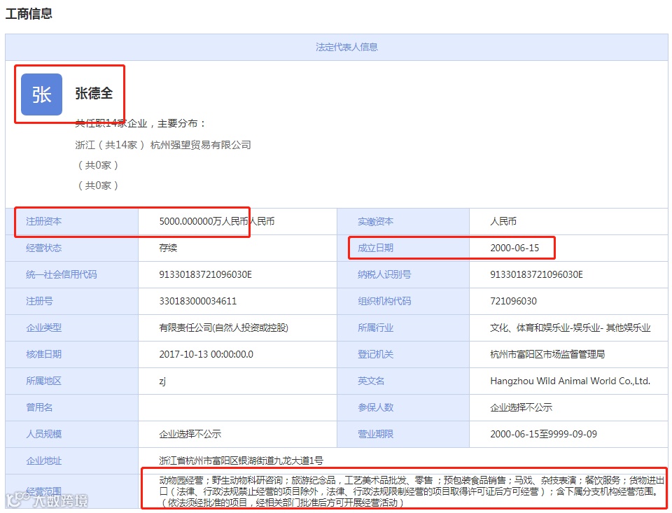 企盾宝资料显示,杭州野生动物世界是华东地区颇具规模且可自驾车入园游玩的野生动物园,是集动物保护、动物繁殖、濒危动物救护与保护、文化科普教育及动物科学研究为一体的观光游览、休闲娱乐的综合性生态公园。杭州野生动物世界的运营主体公司为杭州野生动物世界有限公司,公司法人代表为张德全,公司注册资金为5000万人民币,公司注册时间为2000年6月15日,注册地位于杭州富阳区,其经营范围包括动物园经营;野生动物科研咨询;旅游纪念品,工艺美术品批发、零售 ;预包装食品销售;马戏、杂技表演;餐饮服务;货物进出口;含下属分支机构经营范围。