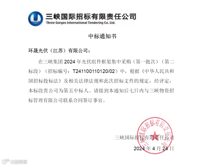 4月23日,三峡集团发布2024年光伏组件框架集中采购(第一批次)中标结果公示。本次招标容量为9GW,其中N型标段二招标容量8.5GW。据悉,共32家企业参与N型标段投标,在产品性能、价格、品牌、供货能力等方面展开激烈竞争。经过评比,环晟光伏凭借突出的综合竞争力成功中标N型标段,获得这一标段容量的10%份额,成为三峡集团2024年N型组件重要供应商。