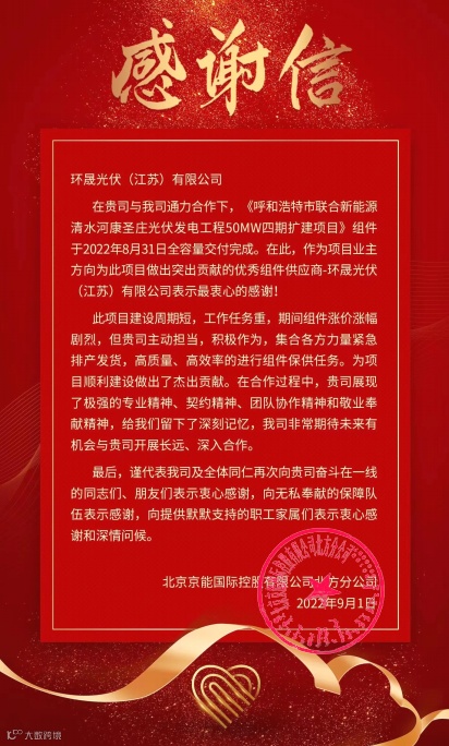 对此,投资方京能国际为感谢环晟光伏为项目提供的大力支持特发来一封感谢信,信中对环晟高质量、高效率的完成组件保供任务给予了充分的肯定和赞扬。