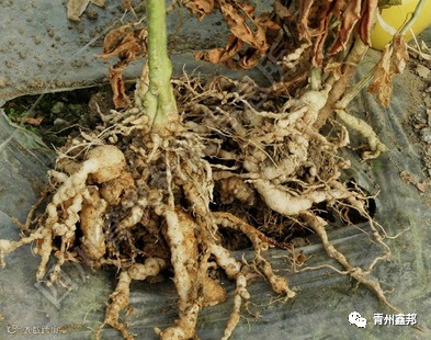 根结线虫主要危害作物的根部,根系被害后侧根和须根较正常增多, 但根系较短,毛细根减少,吸收水肥能力减弱,并在幼根的须根上形成球形或圆锥形大小不等的白色根瘤, 有的呈念珠状。根瘤初为白色, 质地柔软, 后变为褐色, 或暗褐色。植株地上部分由于营养供应不足,造成植株生长缓慢,植株矮小, 叶片黄化、甚至萎蔫提早死亡。