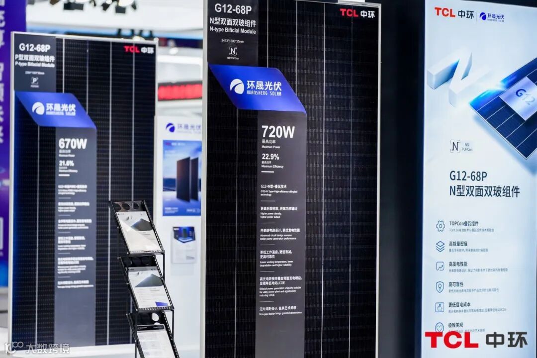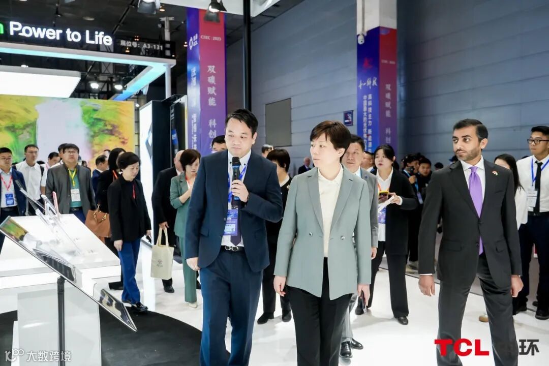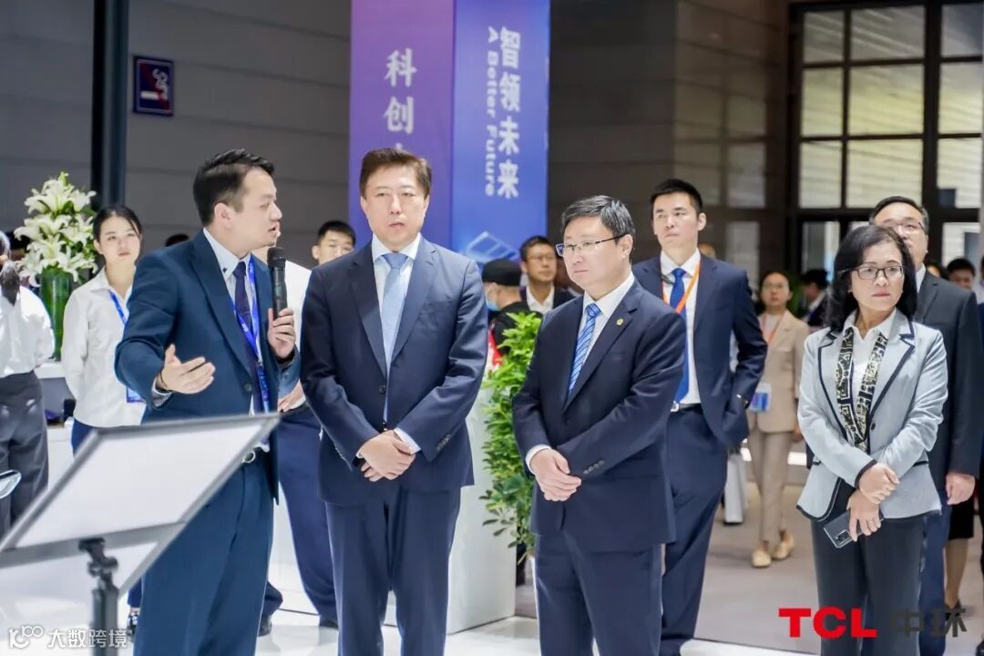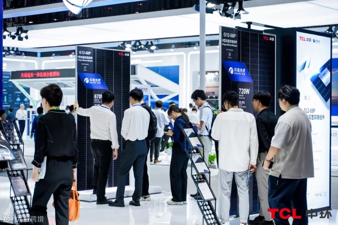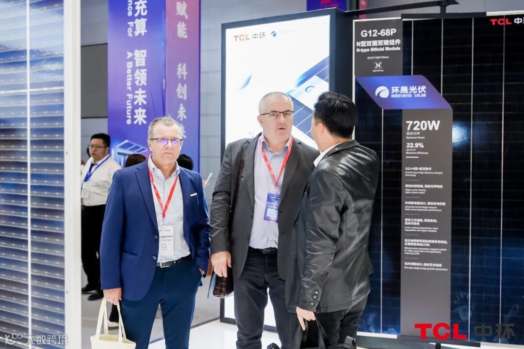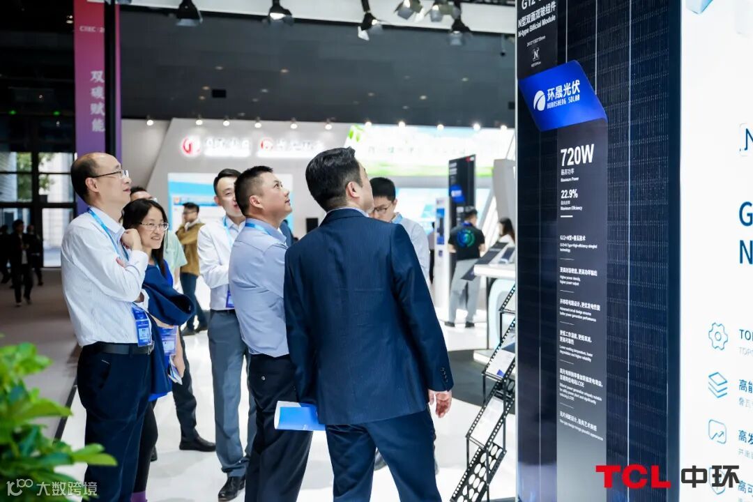 大会巡馆团莅临TCL中环展位参观考察,环晟光伏销售总监沈贯向其详细介绍了TCL中环在宜产业布局、发展情况,并重点解说了此次参展产品G12大尺寸硅片和N型68P高效叠瓦组件。