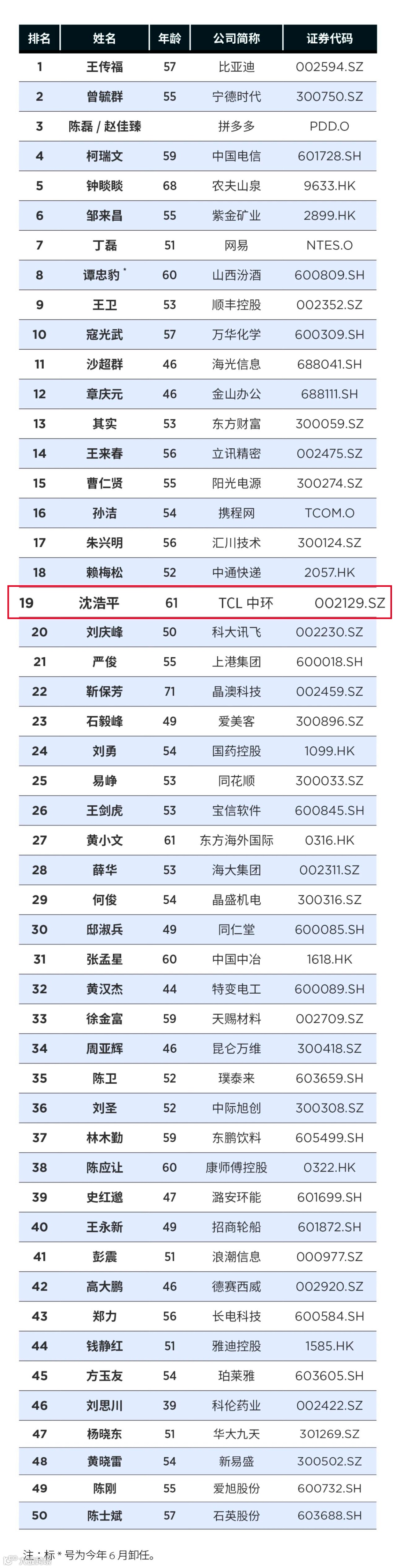 7月12日,福布斯中国发布了“2023中国最佳CEO”榜单,TCL中环总经理沈浩平连续两年入选,排名第19位。