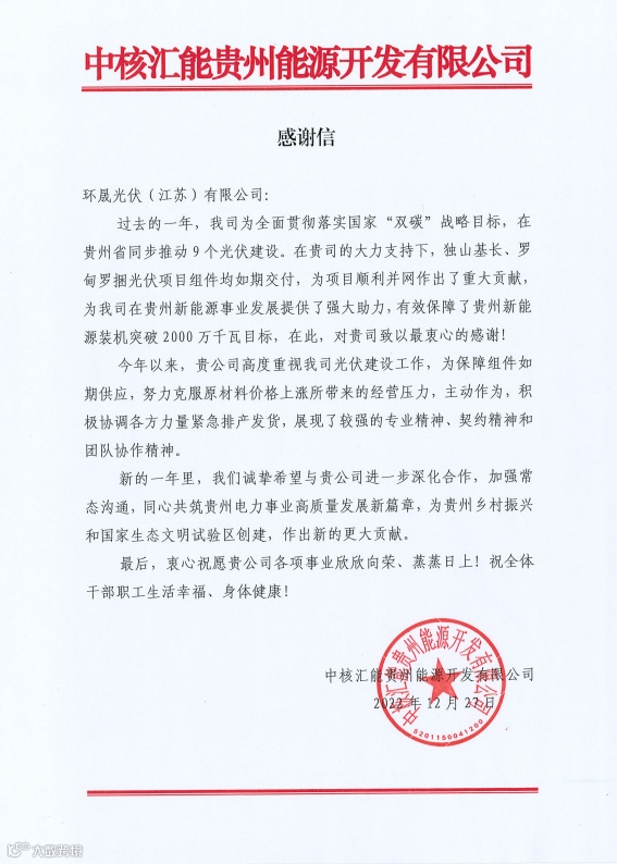 信中特别表扬道,贵司高度重视我司光伏建设工作,为保障组件如期供应,努力克服原材料价格上涨所带来的经营压力,主动作为,积极协调各方力量紧急排产发货,为我司在贵州新能源事业发展提供了强大助力。