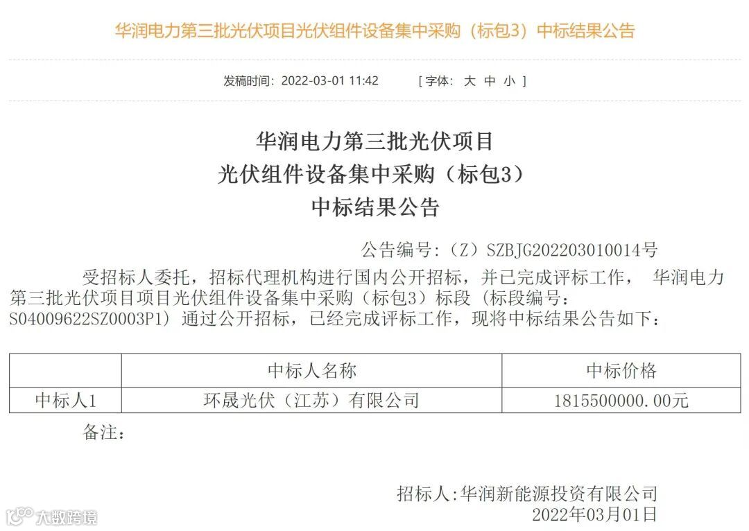 3月1日,华润新能源投资有限公司发布中标公告,环晟光伏成功中标华润电力第三批光伏项目光伏组件设备集中采购(标包3),总规模达1GW,订单金额共计18.15亿元。