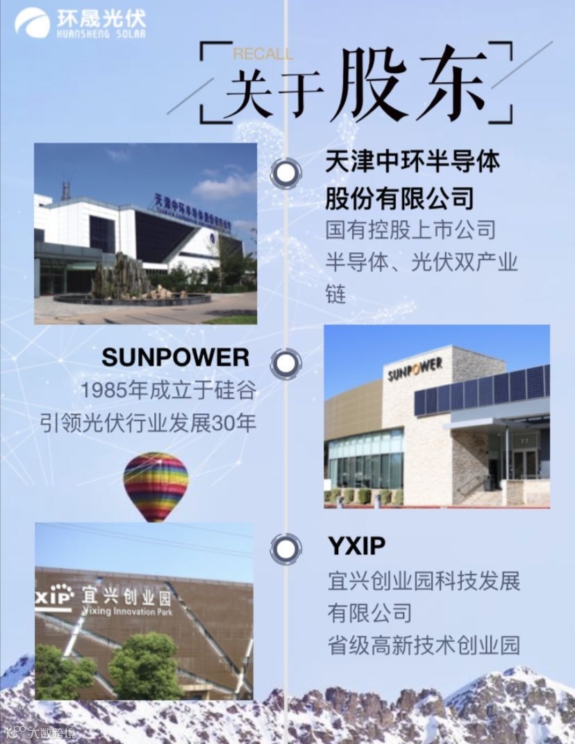 环晟光伏(江苏)有限公司位于江苏省宜兴市经济技术开发区文庄路20号,由天津中环半导体股份有限公司、美国SUNPOWER公司 、宜兴创业园科技发展有限公司三方股东强强联合,共同出资持股,注册资本为11.7亿元,2019年末净资产为12.7亿元。
