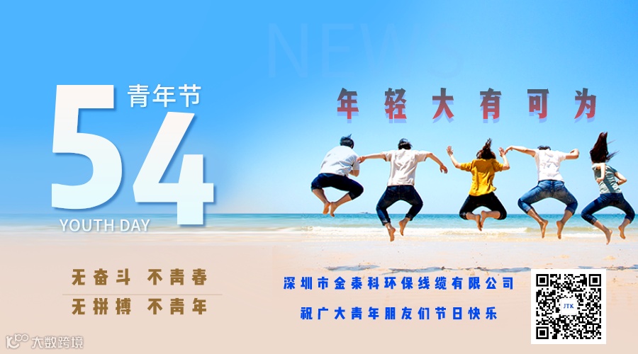 五四精神不仅代表着积极、进步、自由、平等,更是告诉我们美好的生活都是靠自己拼搏出来的。值此五四青年节到来之际,金泰科线缆全体员工祝广大青年朋友们节日快乐,希望你们在这个奋斗的时代里在这个奋斗的年纪里,能摆脱焦虑、摆脱惰性,把握当下,乘风破浪,勇往直前,让青春在不懈奋斗中绽放绚丽之花,加油!