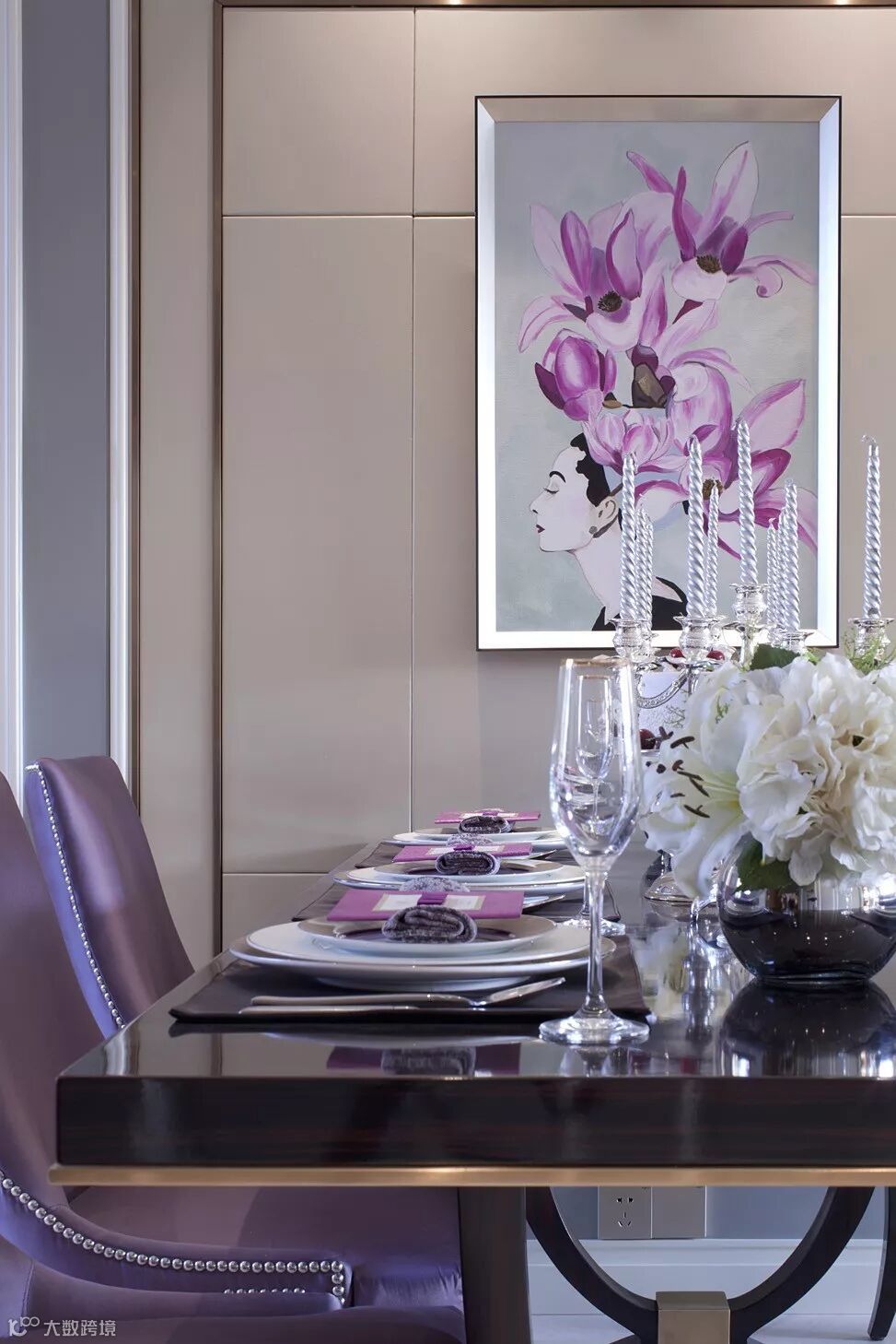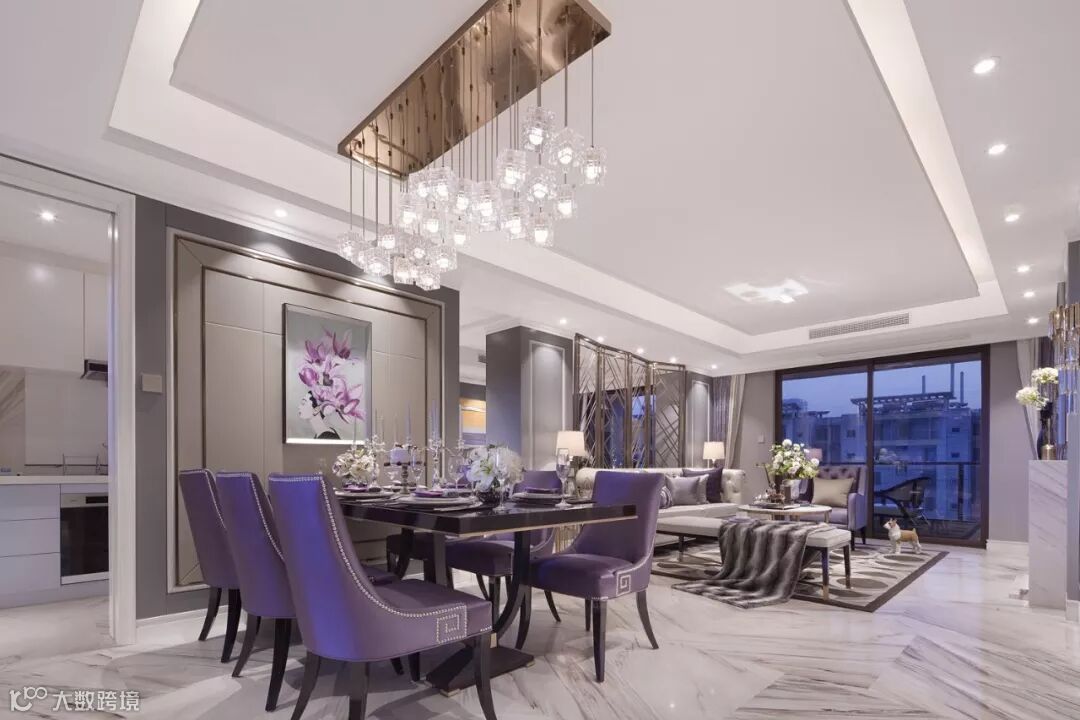 餐厅一抹白色的高雅,一抹紫色的浪漫,不刺眼不杂乱的色彩点缀,在空间中细致拿捏着静谧与活跃,将古典的浪漫,与当下的时尚设计完美结合,新古典风格典雅与潮流并存。