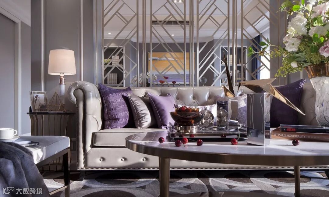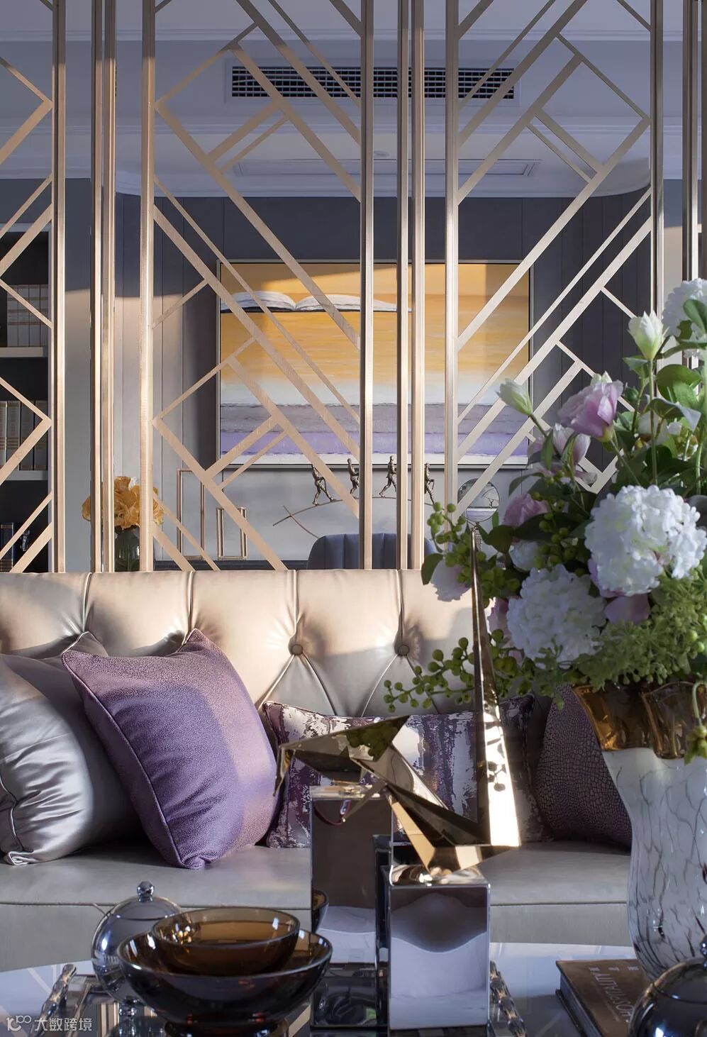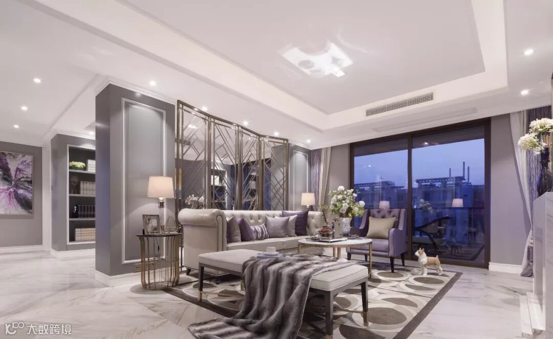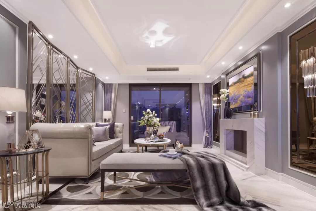 客厅整体空间以浅紫色调作主调,香槟金框条屏风及大理石纹理地板,配以精致家具,满满的艺术气质,以最简洁的线条,交汇出极致舒适的生活哲学。