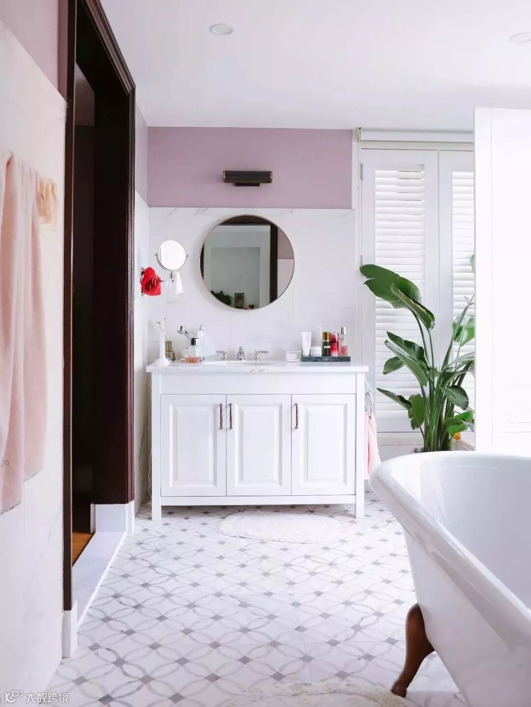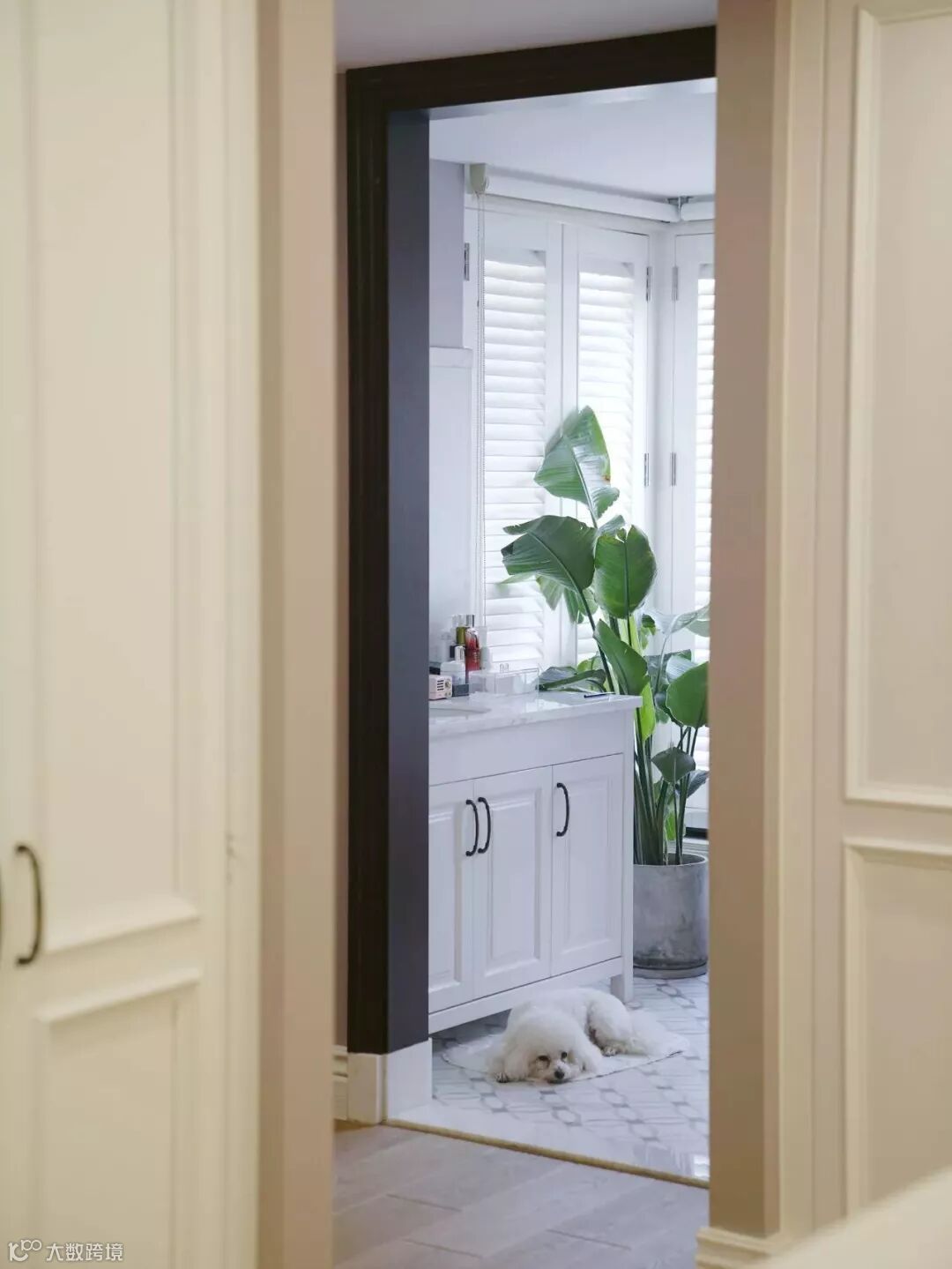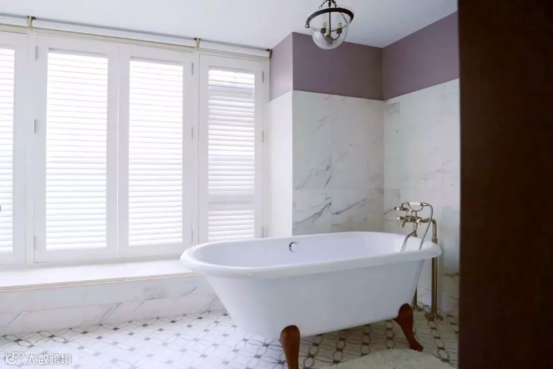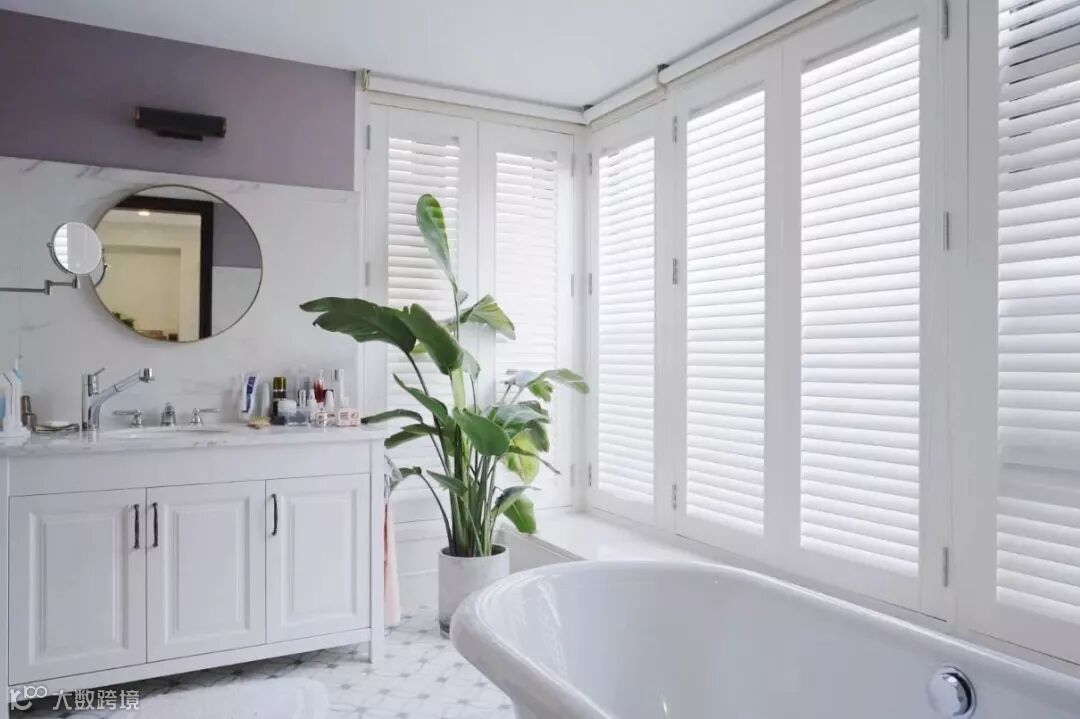 洗手间是大面积的白色大理石墙面搭配一点粉色,比起全白更特别。除了客厅其他房间全都加装白色的百叶窗。