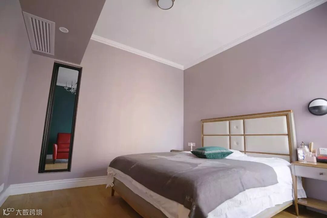 卧室、衣帽间、洗手间的部分墙面,选择偏香芋色的粉色,不会太少女,也不会太甜。房间里用这样的莫兰迪色,令人放松舒适。