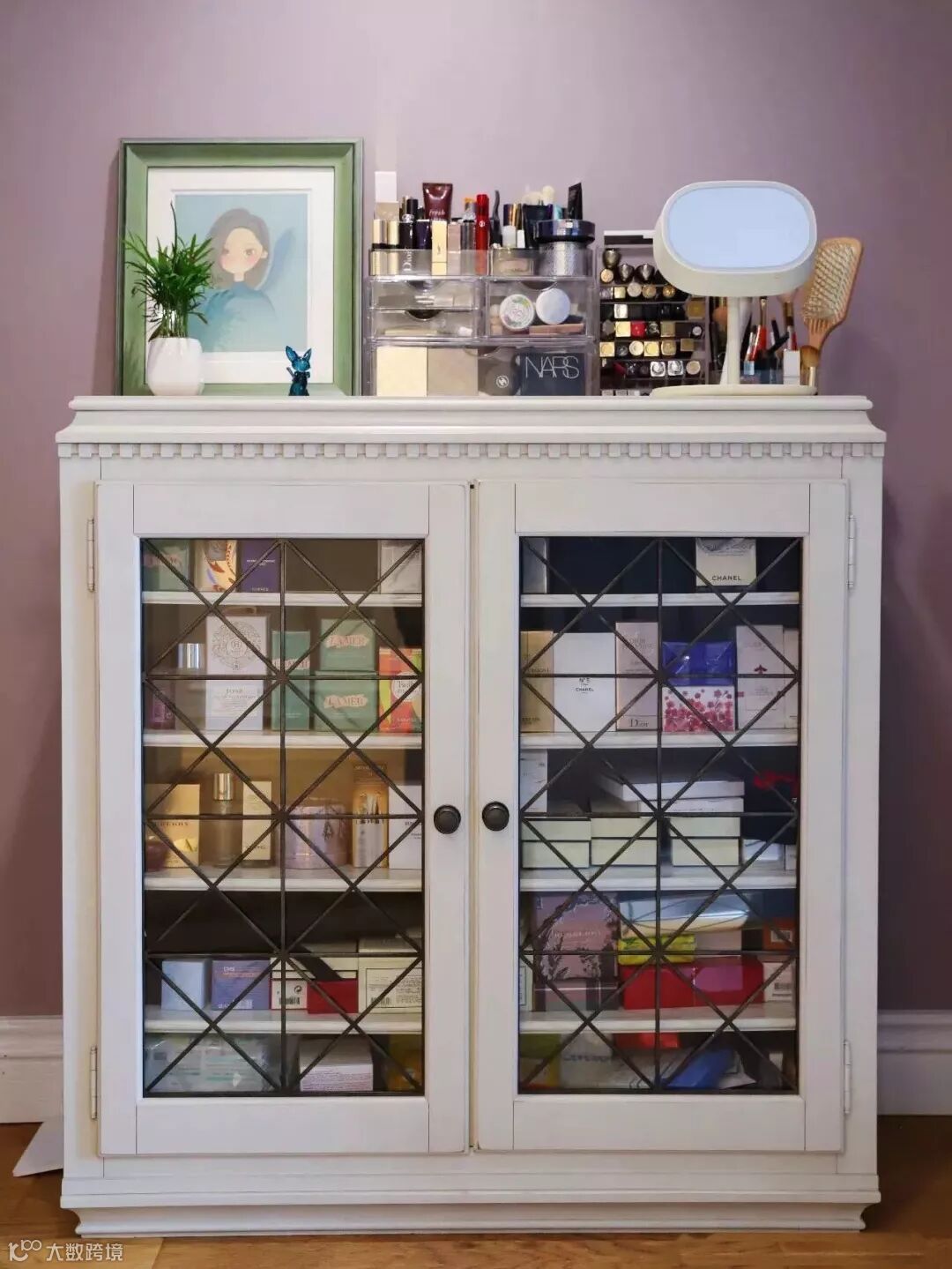 衣帽间的正中间是首饰柜,首饰柜上面放了常用的香水和指甲油。