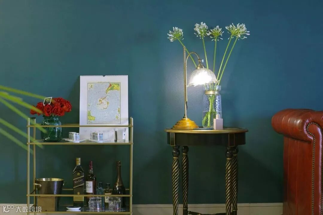 沙发的另一面放了金色的酒吧车,上面放了地图挂历,下面摆放一些酒和酒器,绿墙和金色非常合搭,更具复古风范。