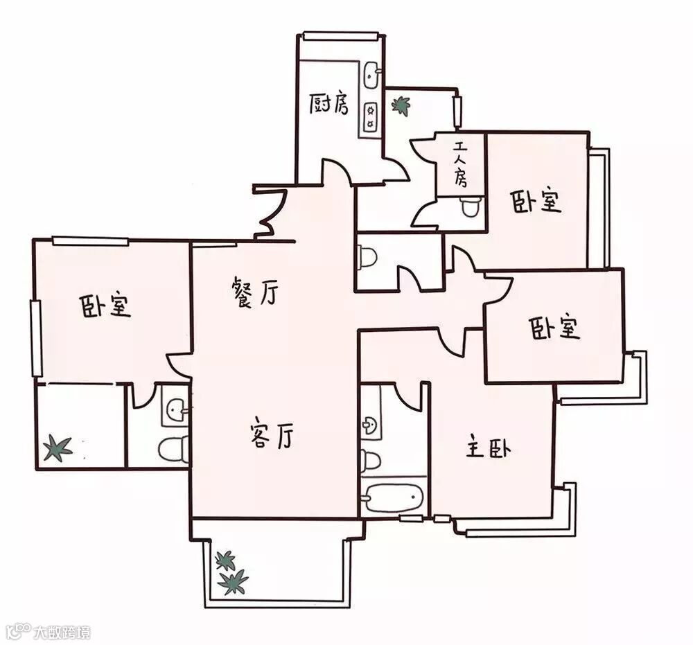 设计师把房子的格局做了大的改动:把房子原来的东边的三个房间、三个洗手间打通改成一整个套间的概念。