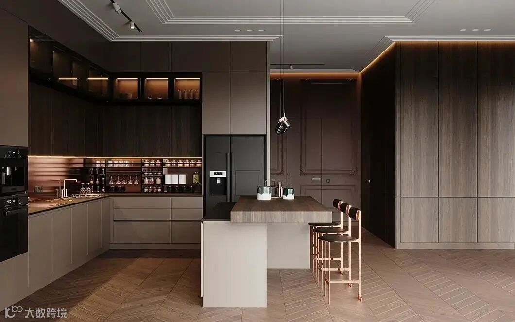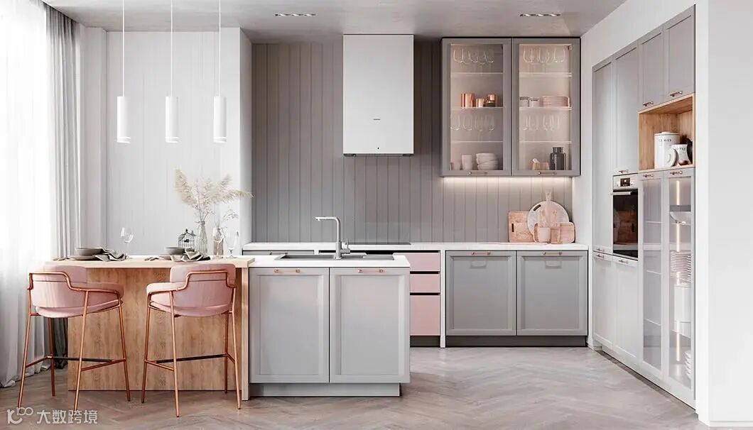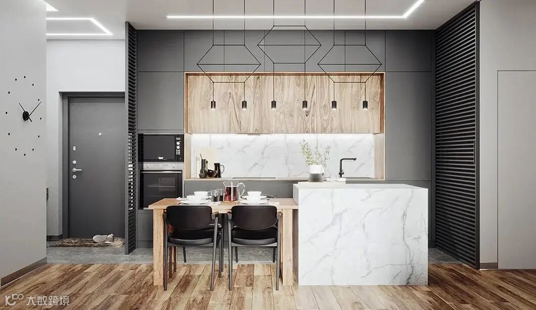 第二,吊挂式橱柜的下方需要加设灯具,因为橱柜会遮挡光线,形成暗角。采用灯带或者小型射灯增加梅柜下方工作区的照度就可以。