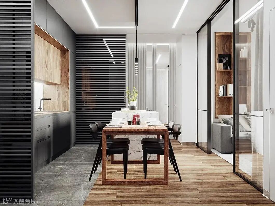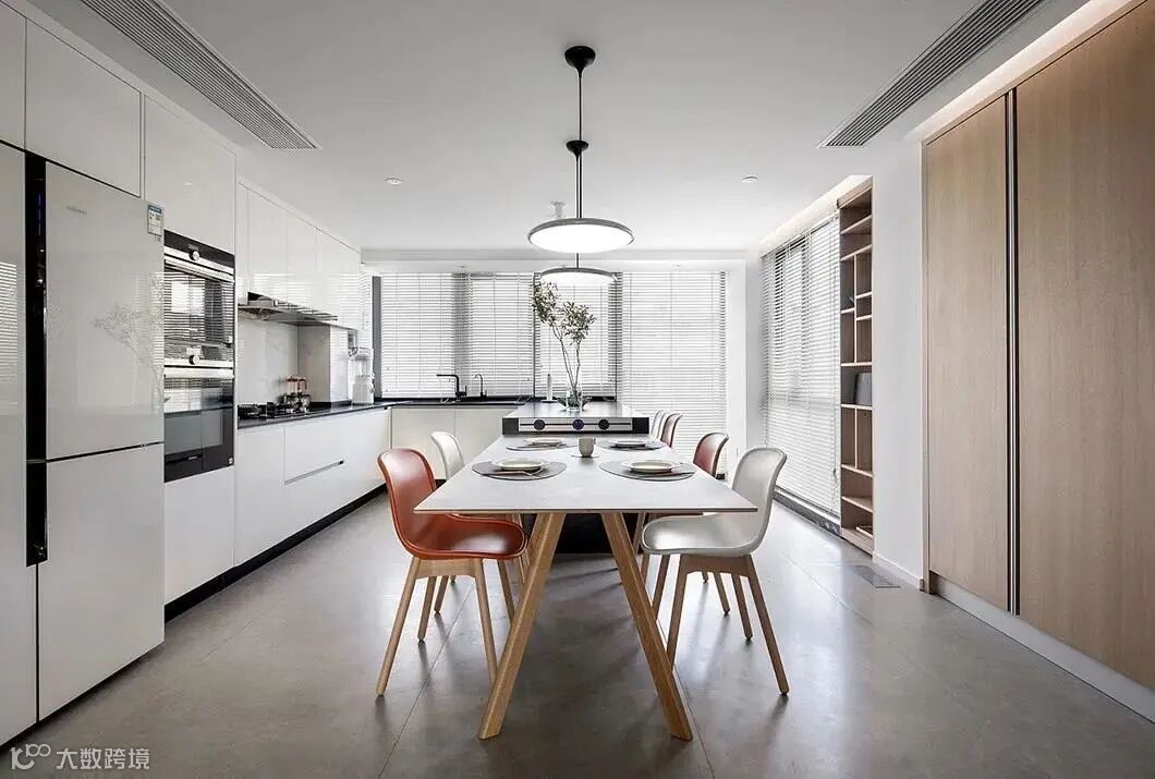 餐厅的环境光与客厅一样采用分散光源。焦点光设置在餐桌中间,可选用有造型感的吊灯,增加空间的个性也带来好食欲,光源距离桌面约65cm即可。